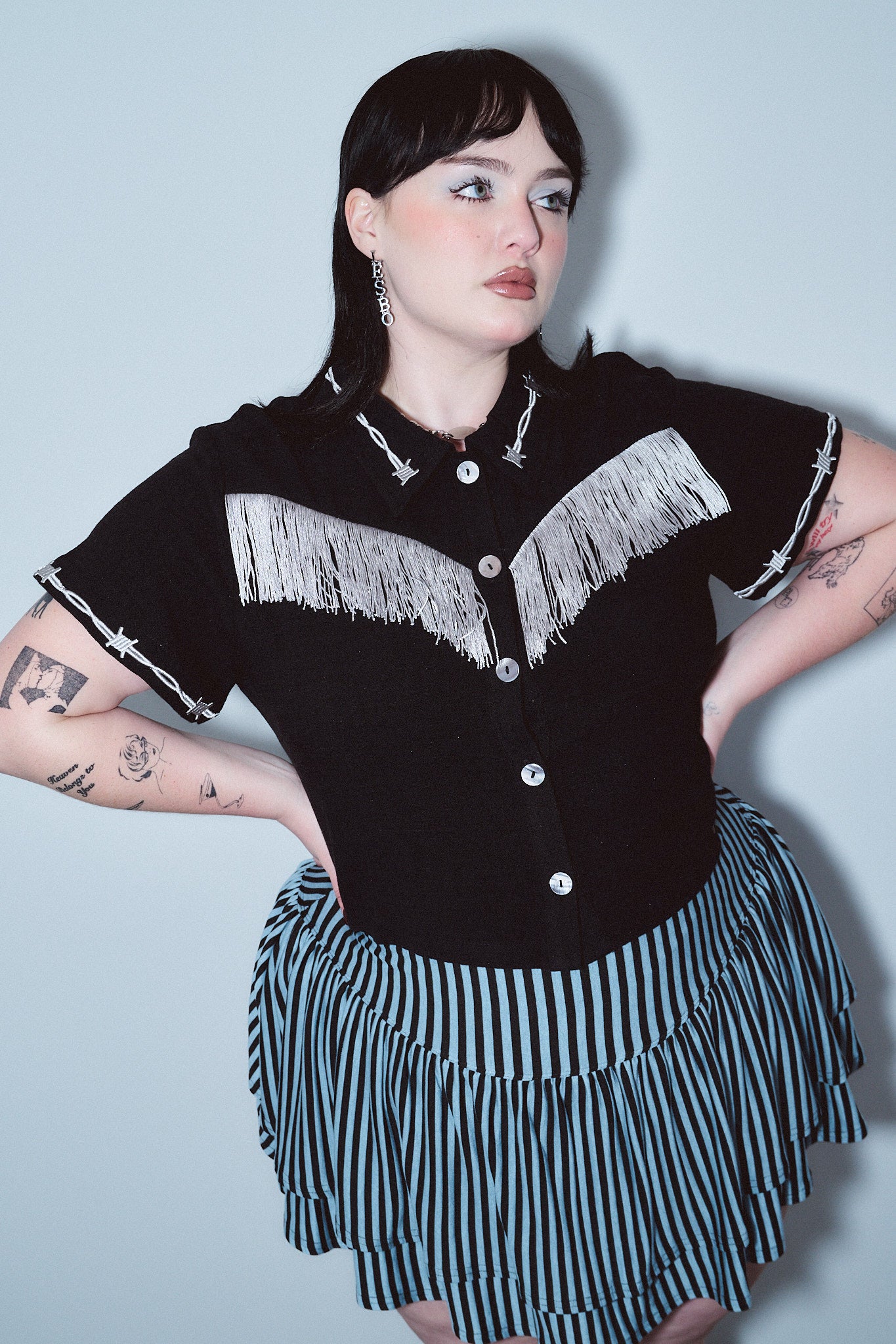 A flattering cropped cut with barbed wire embroidery on the collar and sleeves. Sharp silver fringe. Makes you wanna get on a yacht and make some memories.