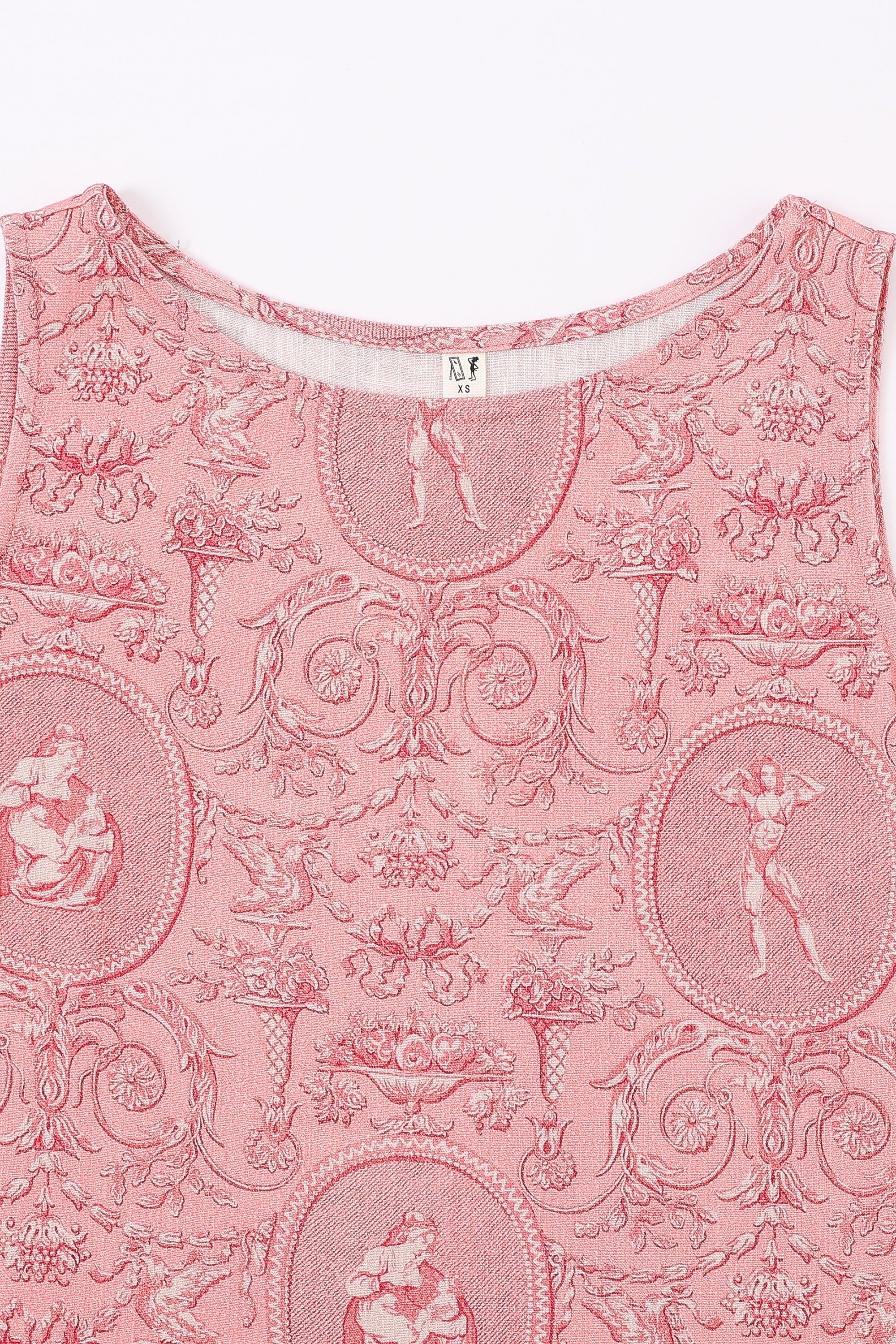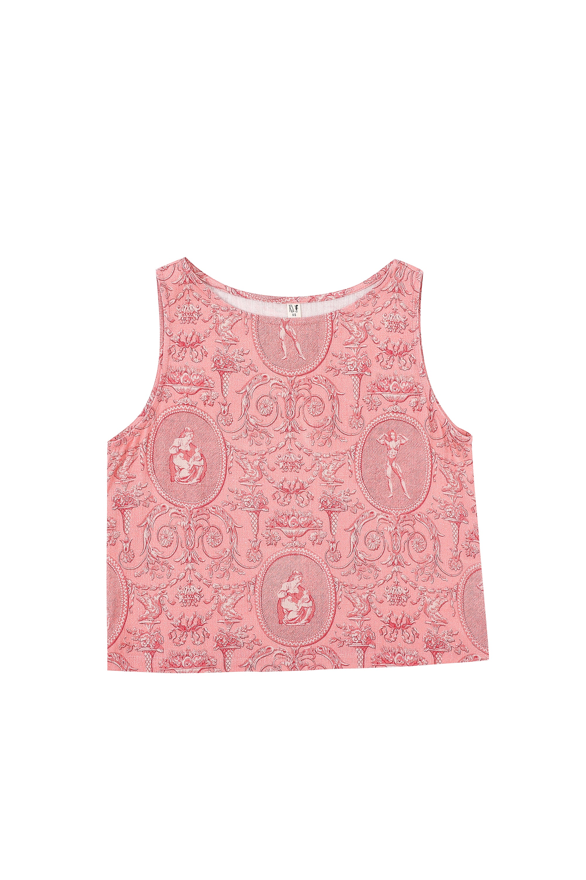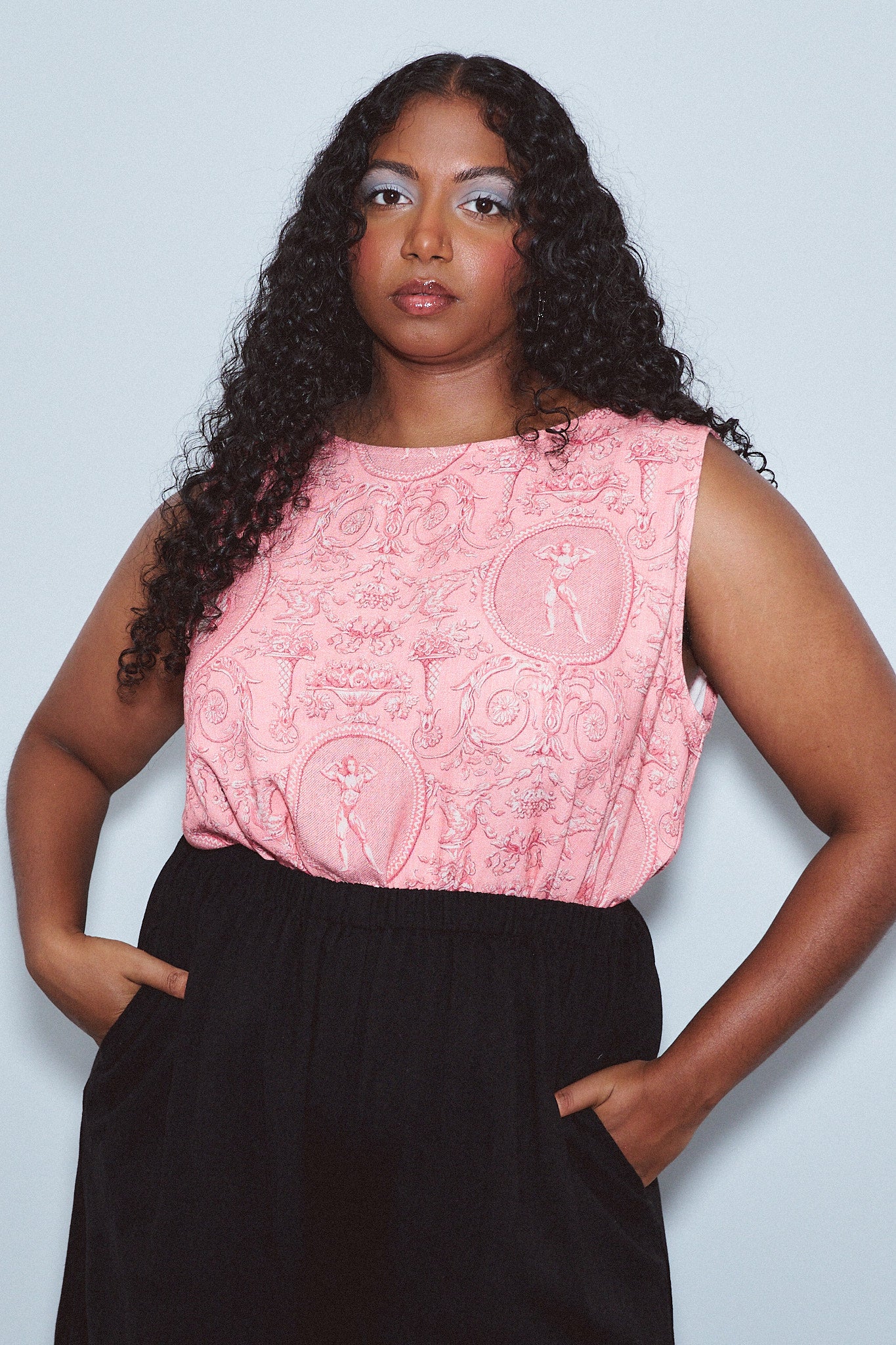 -new soft linen blend in new print featuring a woman walking a man, a female bodybuilder, and a mother squirting milk into a babies mouth.