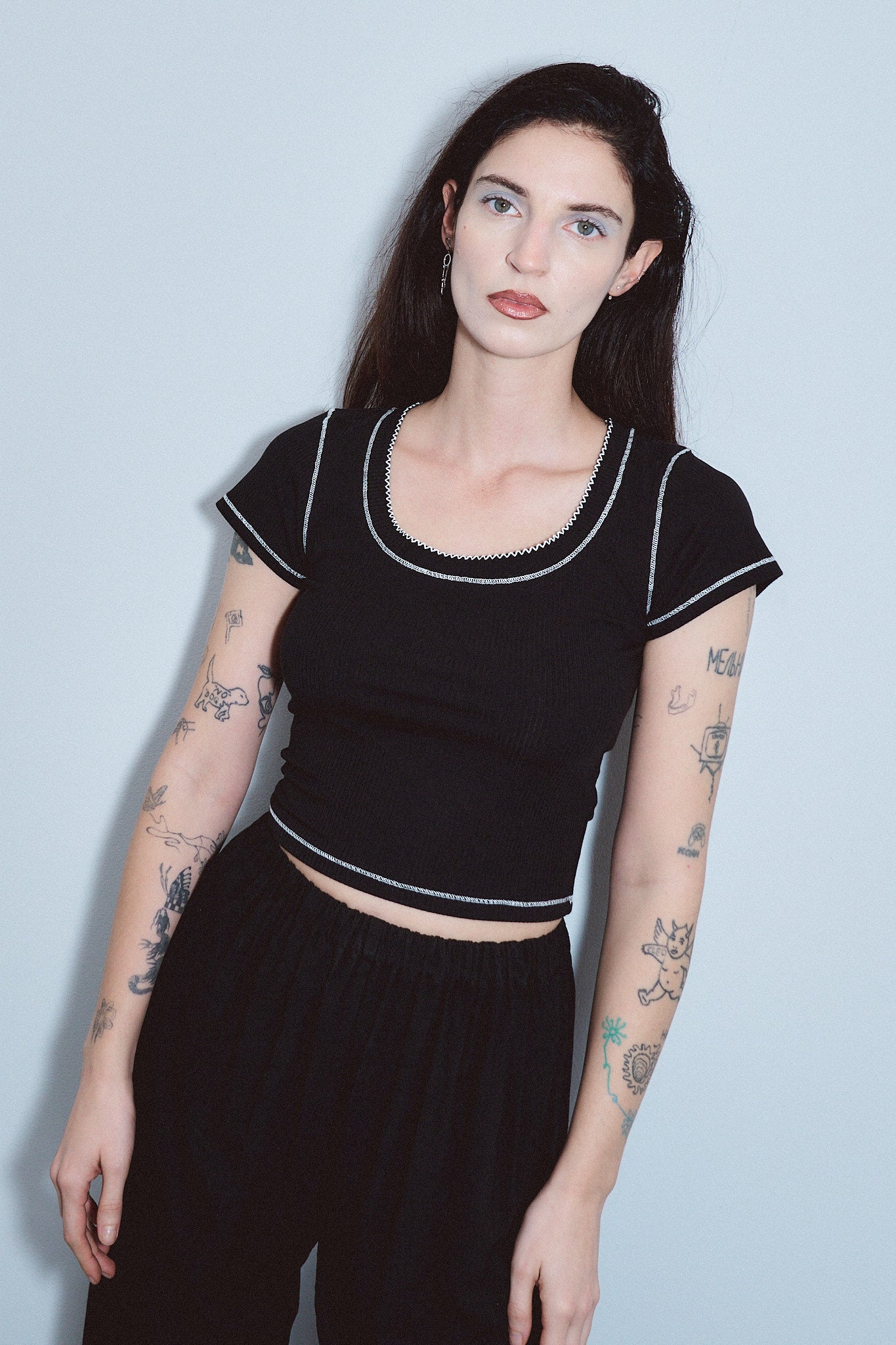 Scoop Tencel Rib Contrast Seam Baby Tee Black