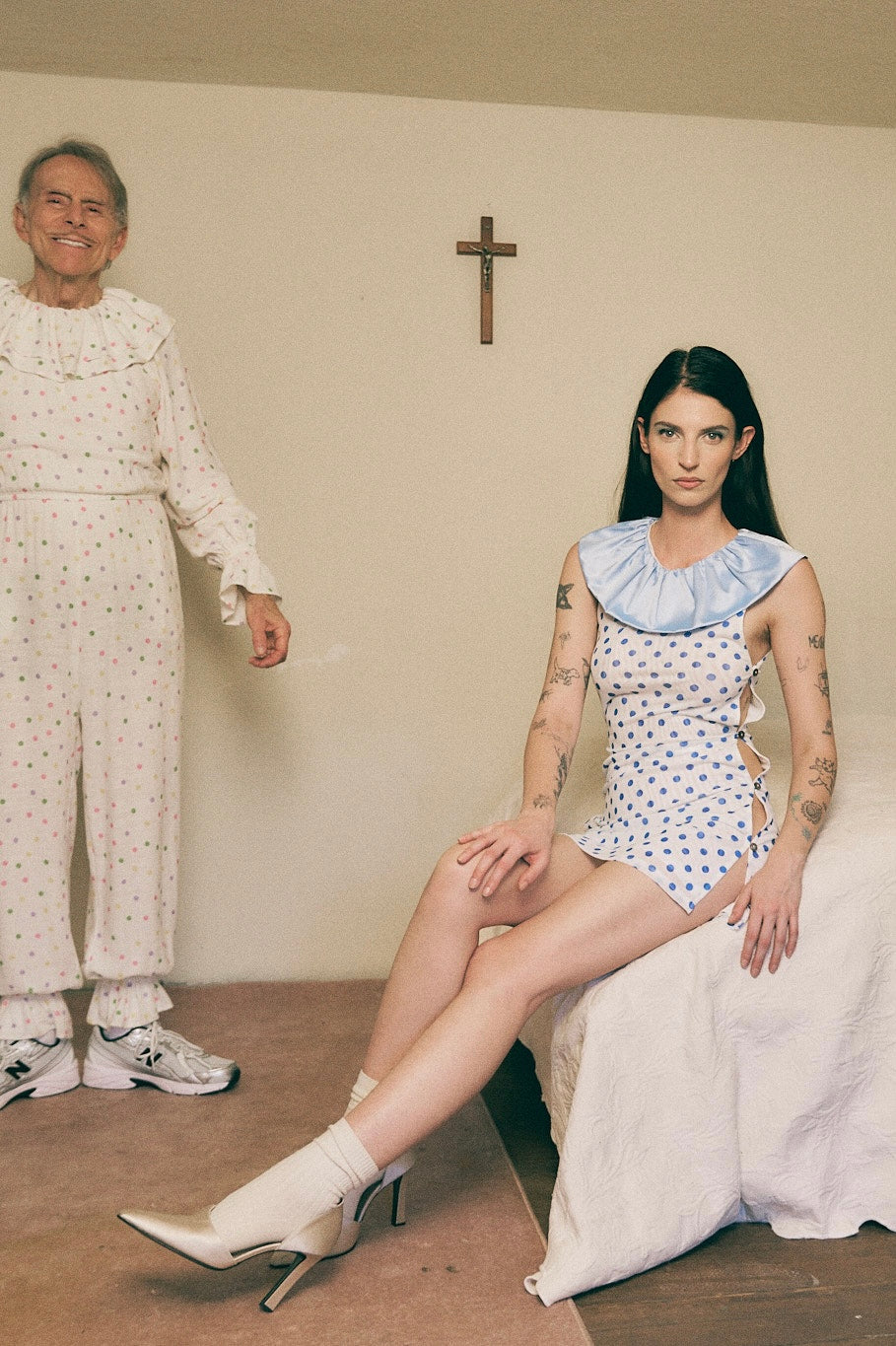 Mesh Clown Collar Dress Blue Polka Dot