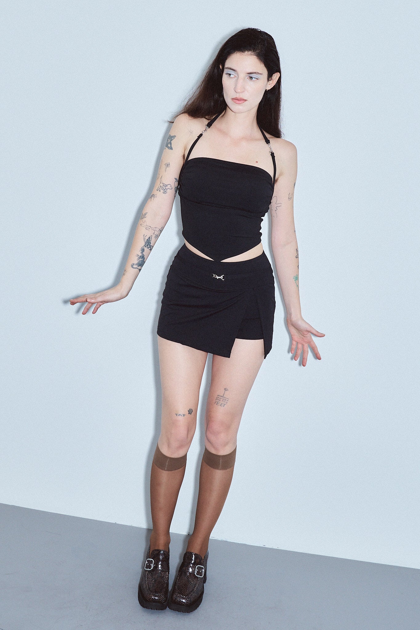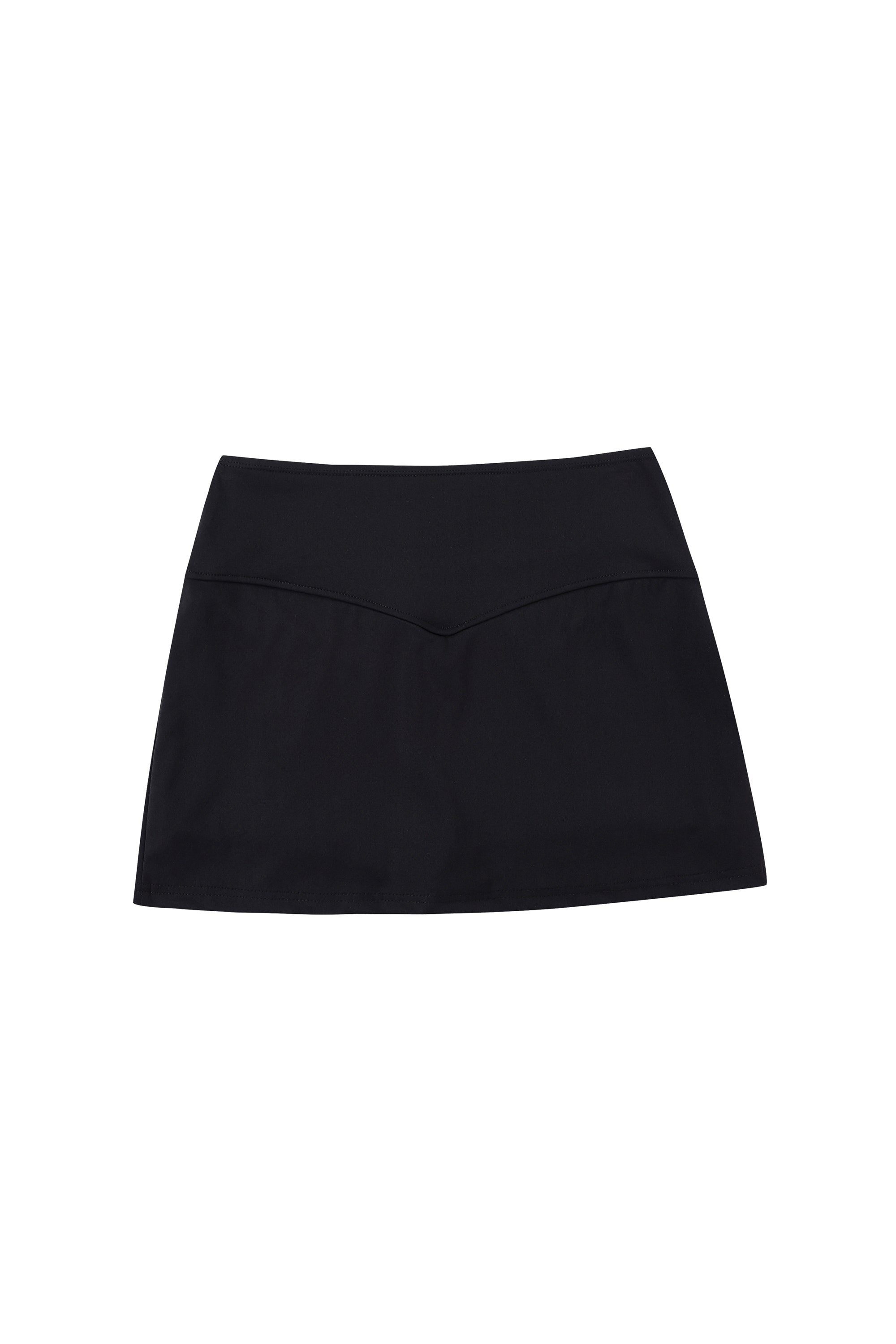 -stretch ponte pull on skort with skirted back and front and slit in the front revealing the shorts underneath