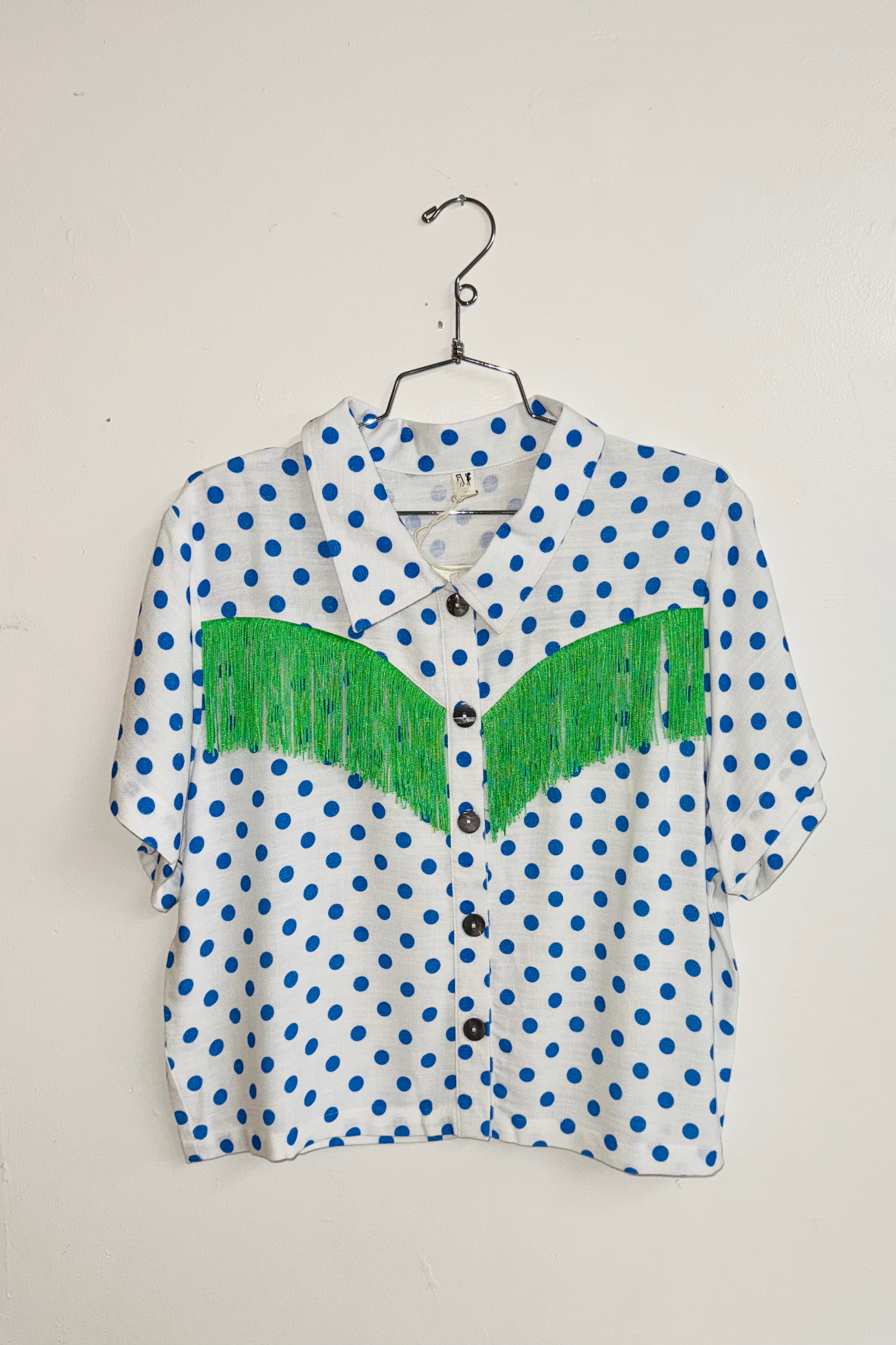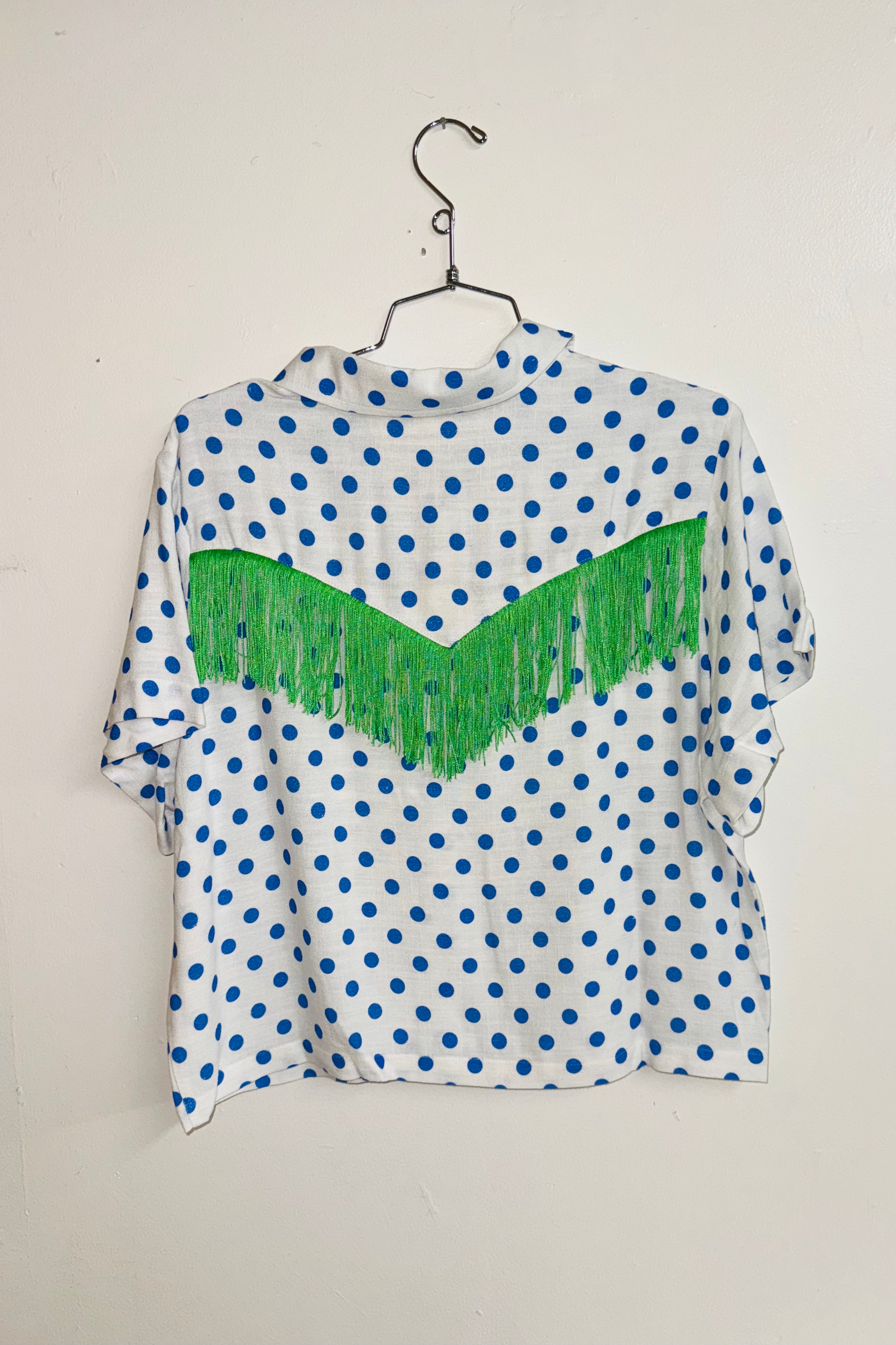 Cropped Blue Polka Dot Print  / Green Fringe Blouse