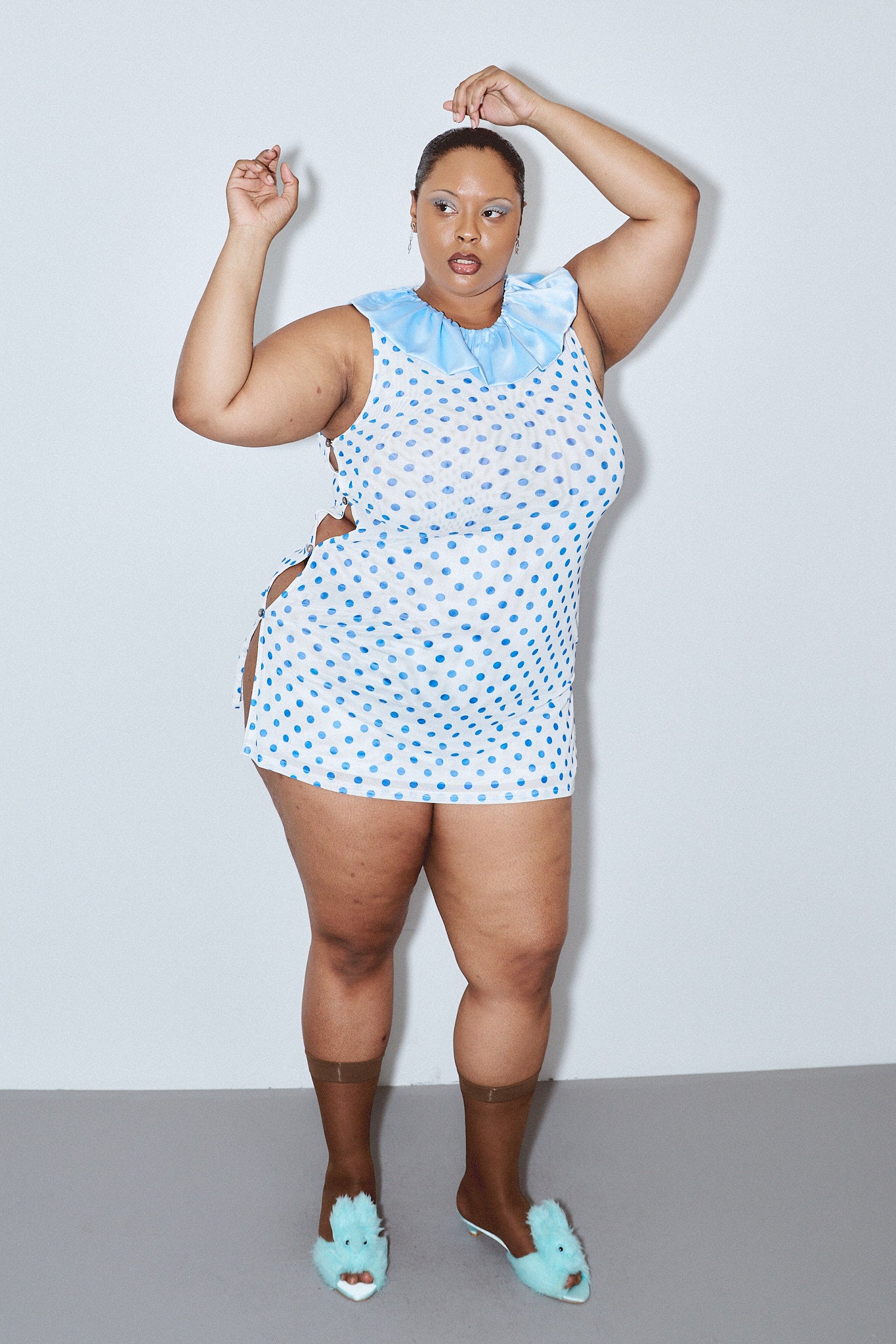 Mesh Clown Collar Dress Blue Polka Dot