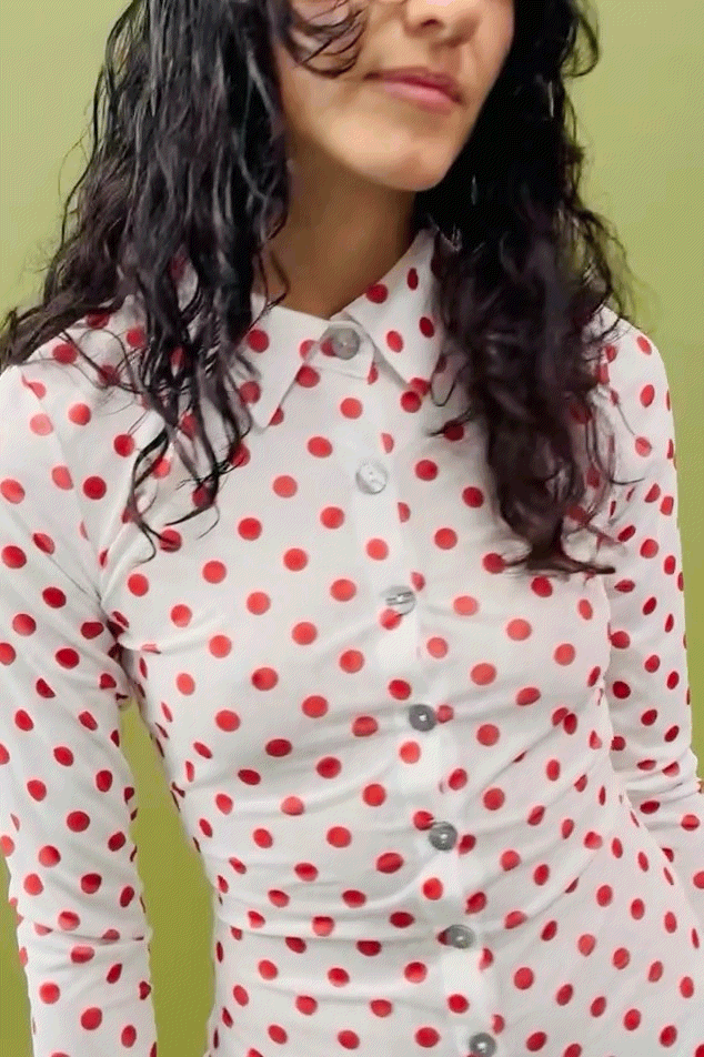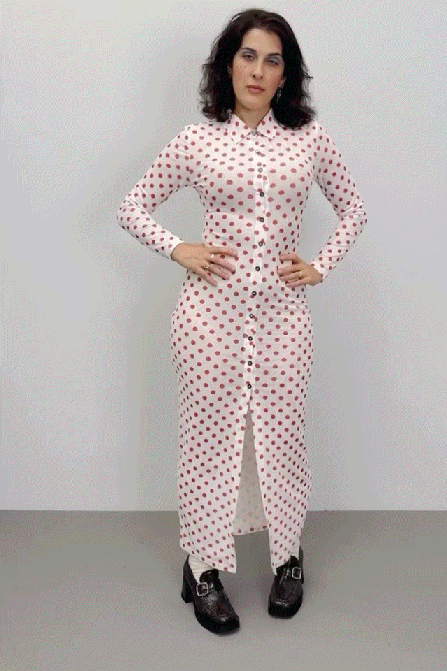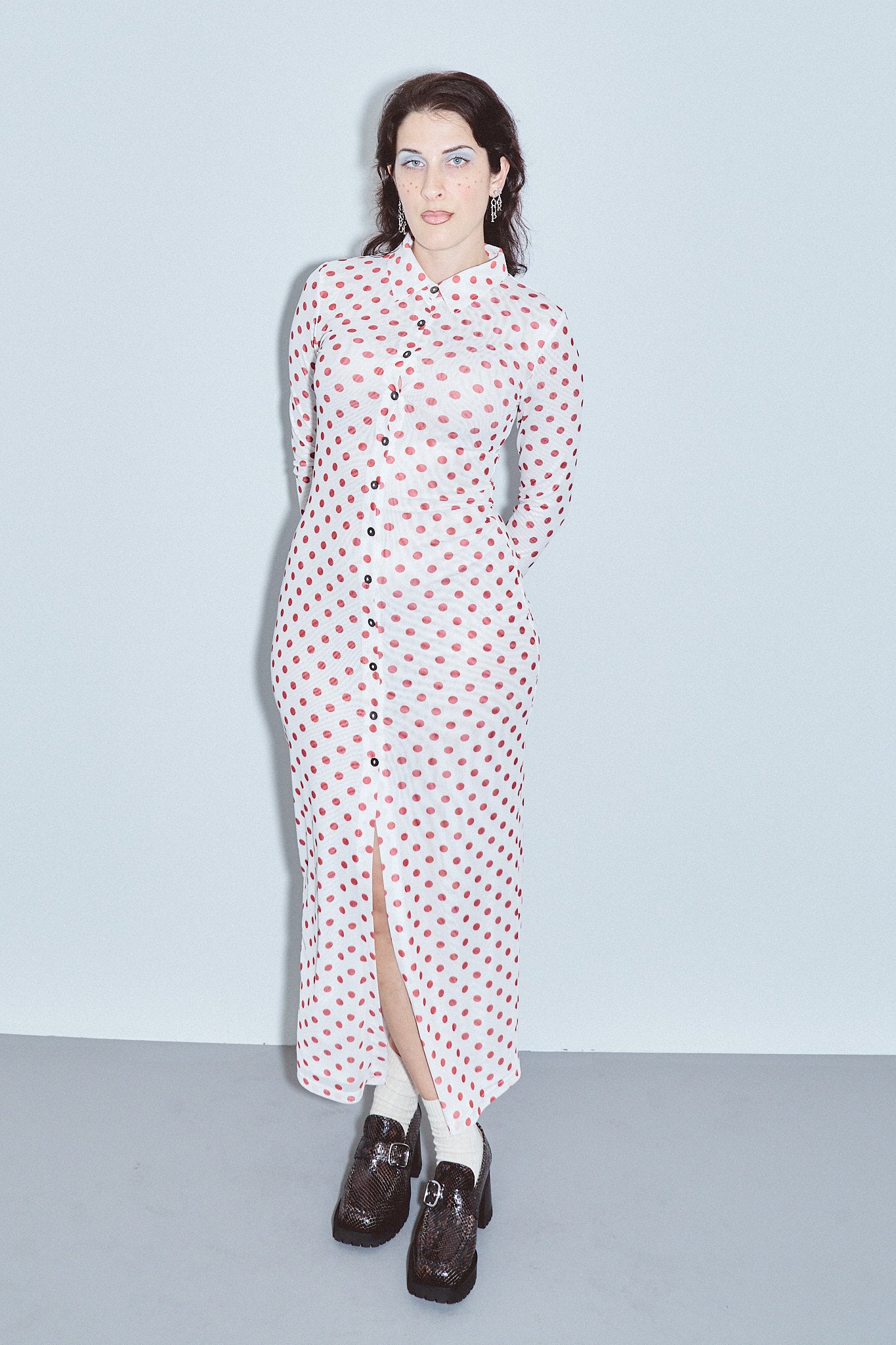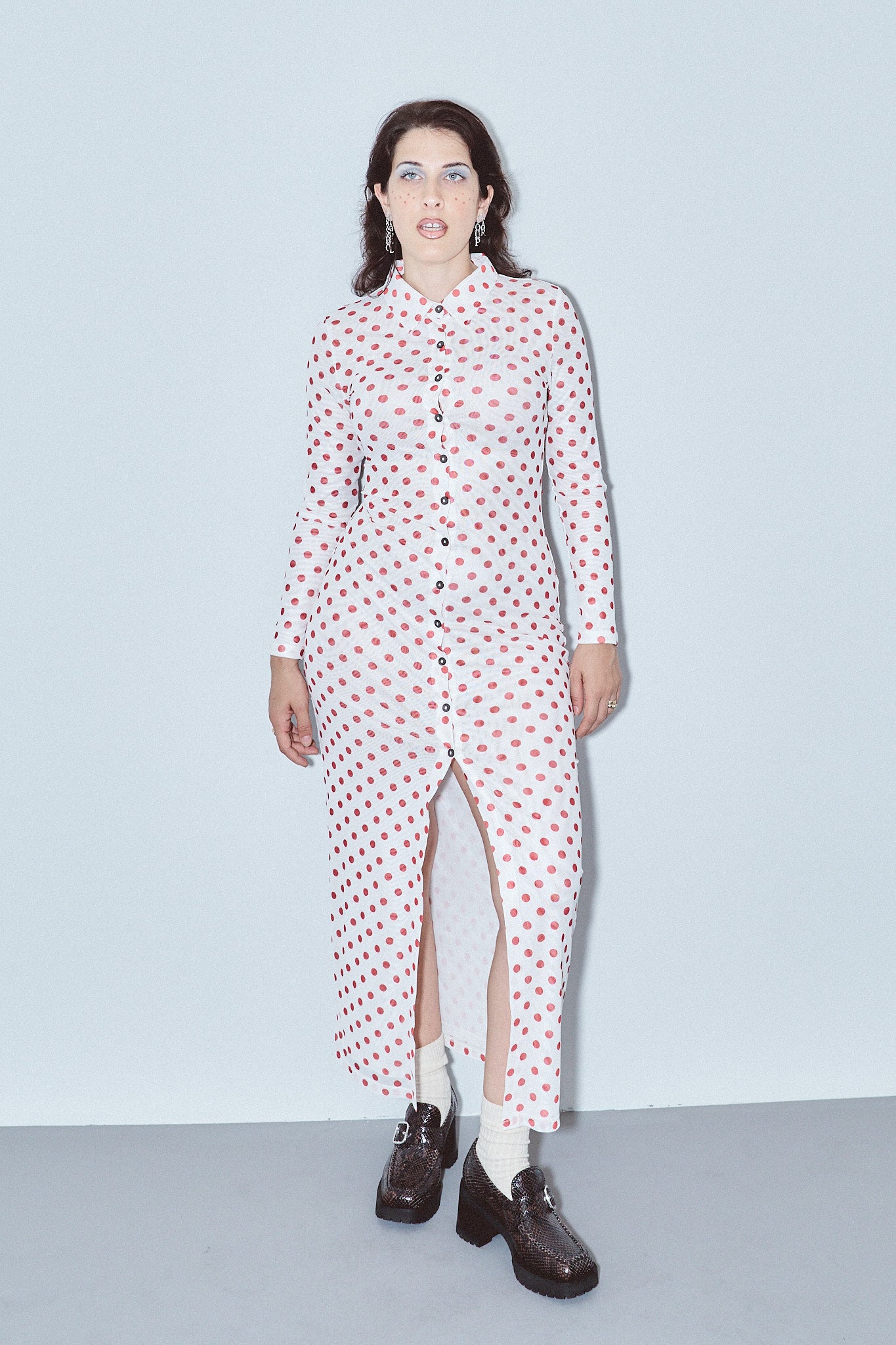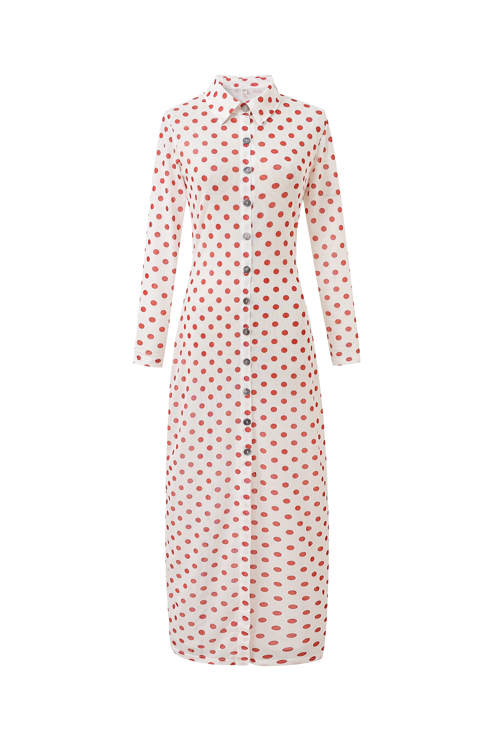Red Polka Dot Mesh Long Sleeve Button Dress