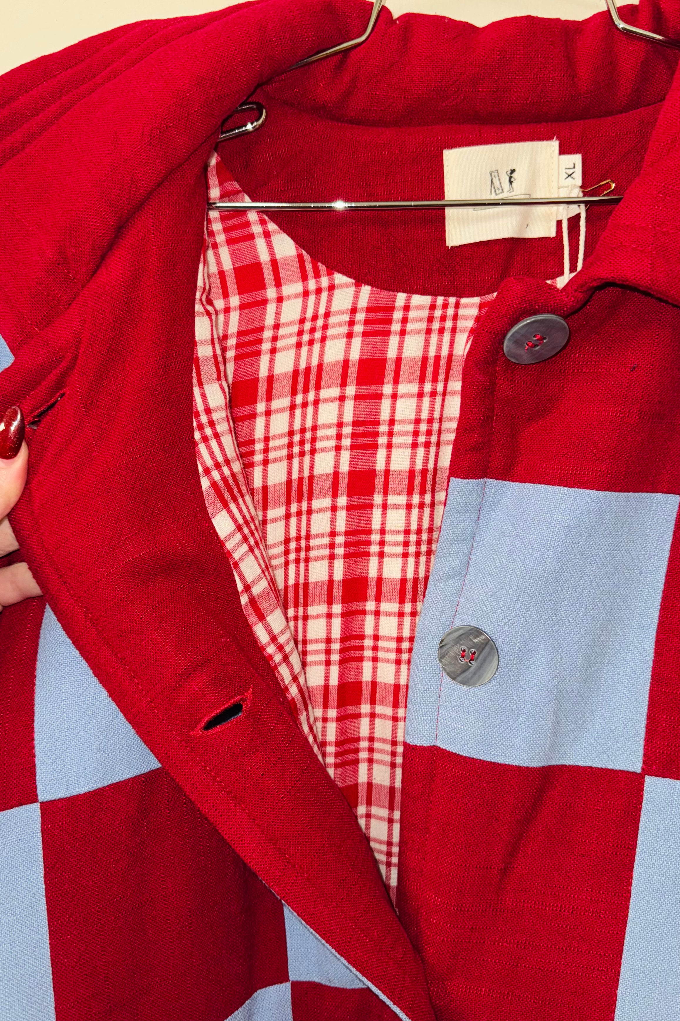 #22 XL/1X Scrap Chessboard Quilted Coat Burgundy/Blue
