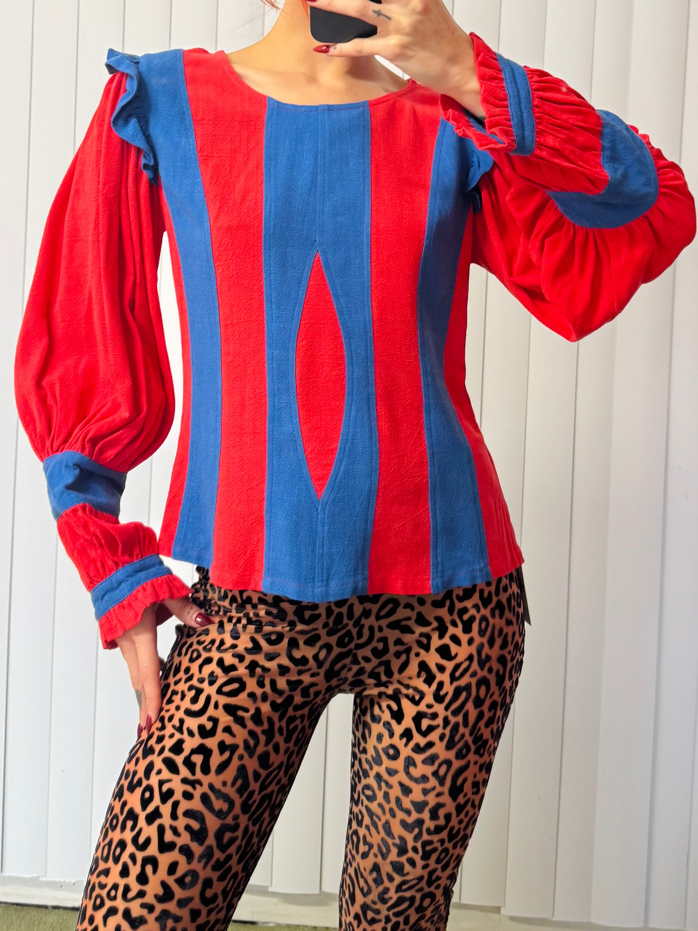 SAMPLE #825 - S Blue and Red Bishop Sleeve Top