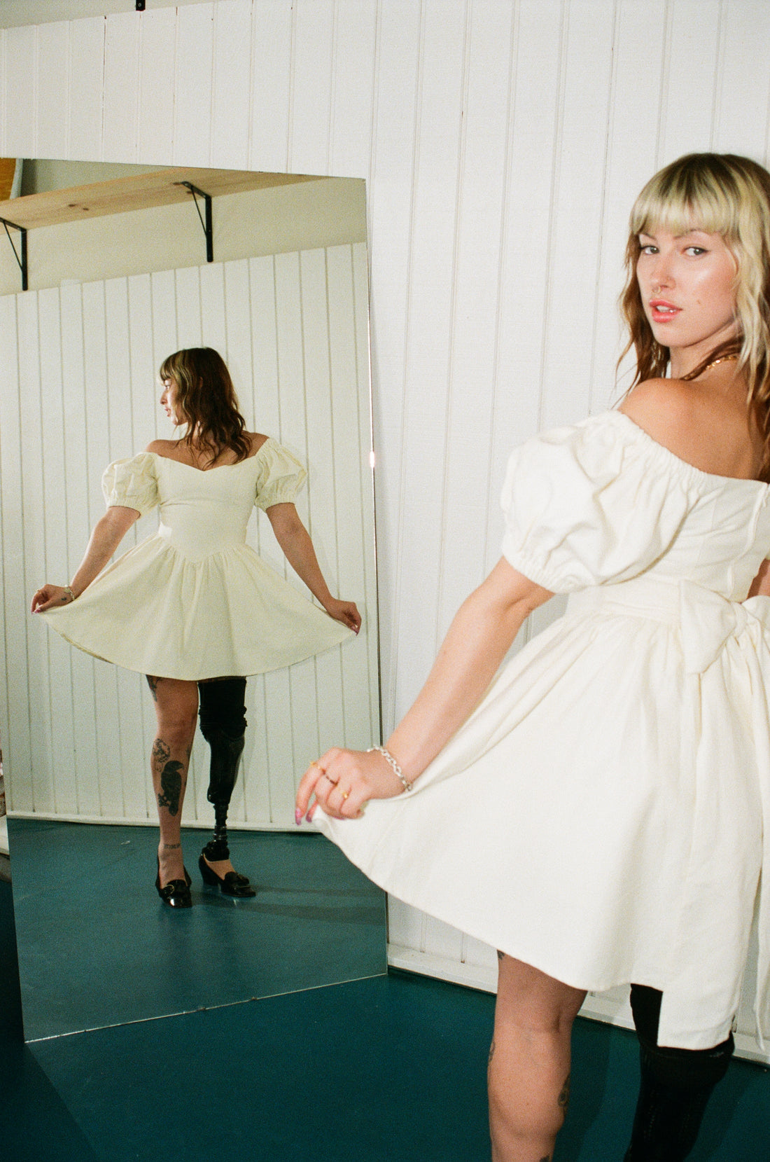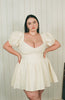 Made from thick 100% cream colored cotton that feels like a mix between denim and canvas. You’ve got this beautifully structured skirt and bodice, both lined with soft white thin cotton, and perfectly crafted sleeves that can be worn on or off the shoulder. Perfect for stealing the spotlight at someone else’s wedding.